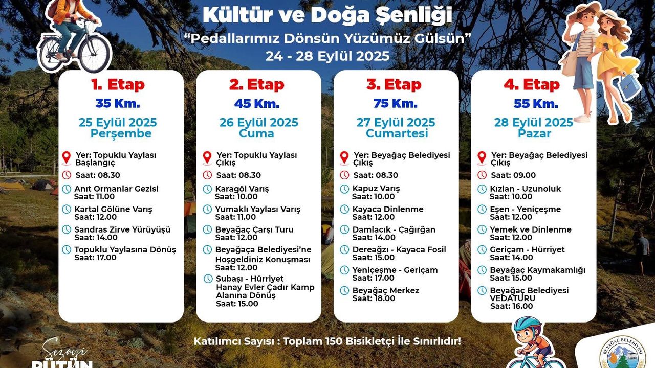 25 Eylül Perşembe başlayacak olan ilk tur Topuklu Yaylasından başlayarak Anıt Ormanlar, Kartal Gölü ve Sandras Dağı Zirvesi olmak üzere 35 kilometrelik tur düzenlenecek. 26 Eylül Cuma günü tekrar topuklu yaylasından başlayacak olan 45 kilometrelik turda Karagöl, Yumaklı Yaylası ve Beyağaç ilce merkezine pedallar çevrilecek. Şenliğin 4’üncü günü 27 Eylül Cumartesi ve 5’inci günü 28 Eylül Pazar, Beyağaç Belediyesi önünden başlayacak olan tur da Beyağaç ilçesinin kırsal mahallerine geziler düzenlenecek.