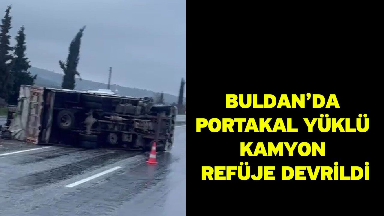 Denizli-Manisa karayolunda Buldan girişinde meydana gelen kazada portakal yüklü kamyon refüje savrularak devrildi. Yaralanan sürücü hastaneye kaldırıldı.