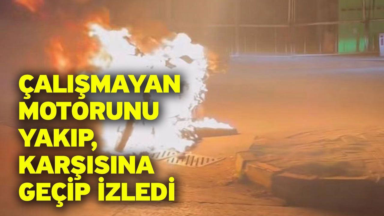 Denizli'de arıza yapan elektrikli motosikletini çalıştıramayan sürücü, aracını yolun ortasında ateşe verdi. Motosikletinin üzerine benzin dökerek ateşe veren sürücü, karşısına oturup yangını izledi.