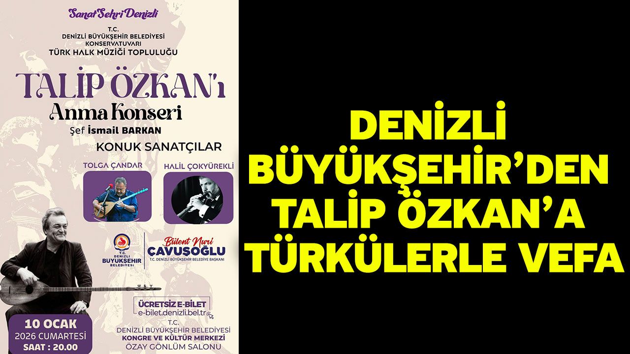 Denizli Haber - Denizli Büyükşehir Belediyesi Konservatuvarı Türk Halk Müziği Topluluğu, Şef İsmail Barkan yönetiminde “Talip Özkan’ı Anma Konseri” düzenleyecek. Bu özel konserde, Türk halk müziğinin güçlü yorumcularından Tolga Çandar, ustanın eserlerini ve Anadolu’nun kadim ezgilerini seslendirecek. Gecede ayrıca, İzmirli nefesli sazlar ustası, Ege Üniversitesi Devlet Türk Musikisi Konservatuvarı’nda zurna ve mey dersleri veren Halil Çokyürekli de sahne alarak anma gecesine katkı sunacak. Talip Özkan’ın anısına düzenlenen konser,10 Ocak 2026 Cumartesi günü saat 20.00’de Denizli Büyükşehir Belediyesi Kongre ve Kültür Merkezi Özay Gönlüm Salonu’nda gerçekleştirilecek. Ücretsiz olarak gerçekleştirilecek konserin biletleri e-bilet.denizli.bel.tr adresinden temin edilebilecek.