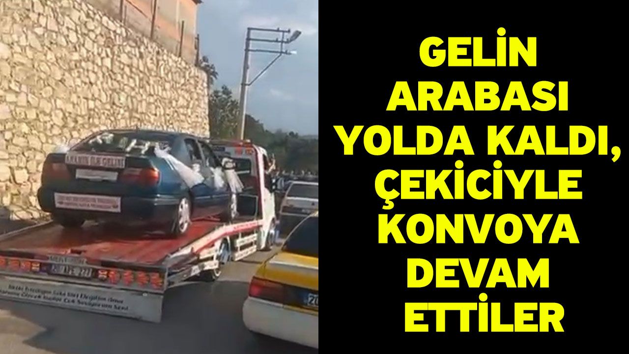 Çekici sürücüsü, gelin ve damada yardım ederek aracı çekicinin üzerine yükledi. Gelin ve damadın içinde bulunduğu araç, bu kez çekicinin üzerinde düğün konvoyuna katıldı.