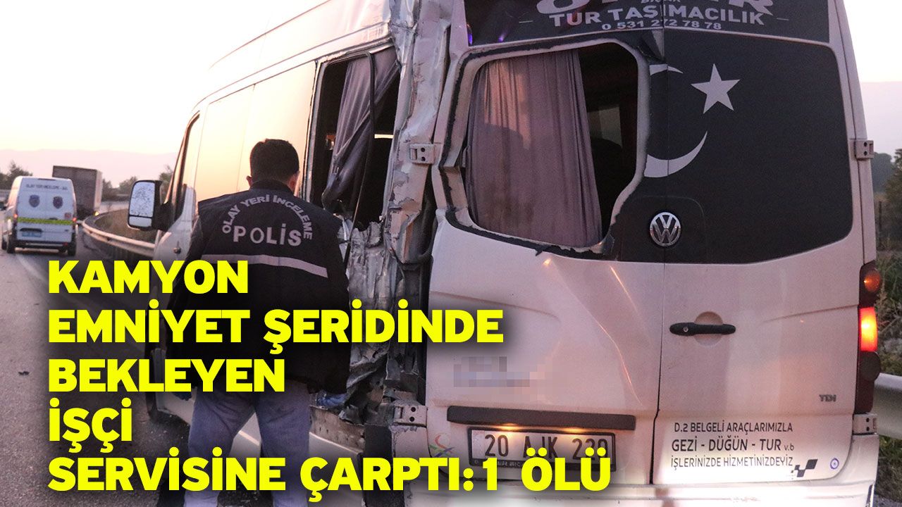 Denizli'de işçi almak için çevreyolu üzerinde emniyet şeridinde bekleyen servise, aynı yönden gelen kamyon çarptı. Kazada servis şoförünün babası hayatını kaybetti.