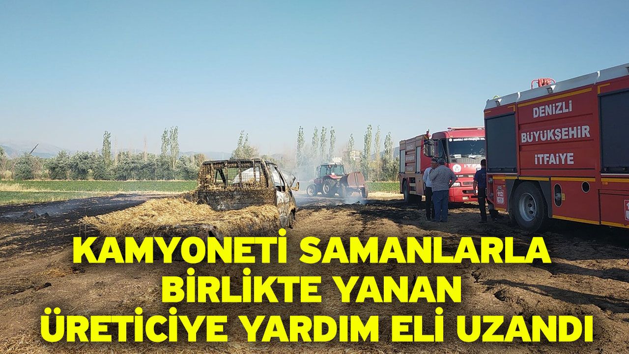 Denizli’de kamyoneti yüklediği samanlarla birlikte yanan yetiştiriciye para ve 150 paket saman yardımı yapıldı.