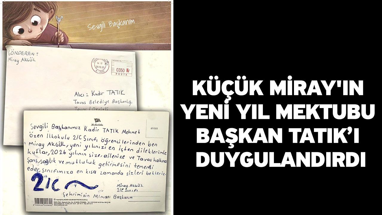 Denizli Haber - Küçük Miray Akgül mektubunda, "Sevgi Başkanımız Kadir Tatık; Mehmet Özen İlkokulu 2/C sınıfı öğrencilerinden ben Miray Akgül. Yeni yılınızı en içten dileklerimle kutlar, 2026 yılının size, ailenize ve Tavas halkına şans, sağlık ve mutluluk getirmesini temenni ederim. Sınıfımıza en kısa zamanda sizleri bekleriz" ifadelerine yer verdi.