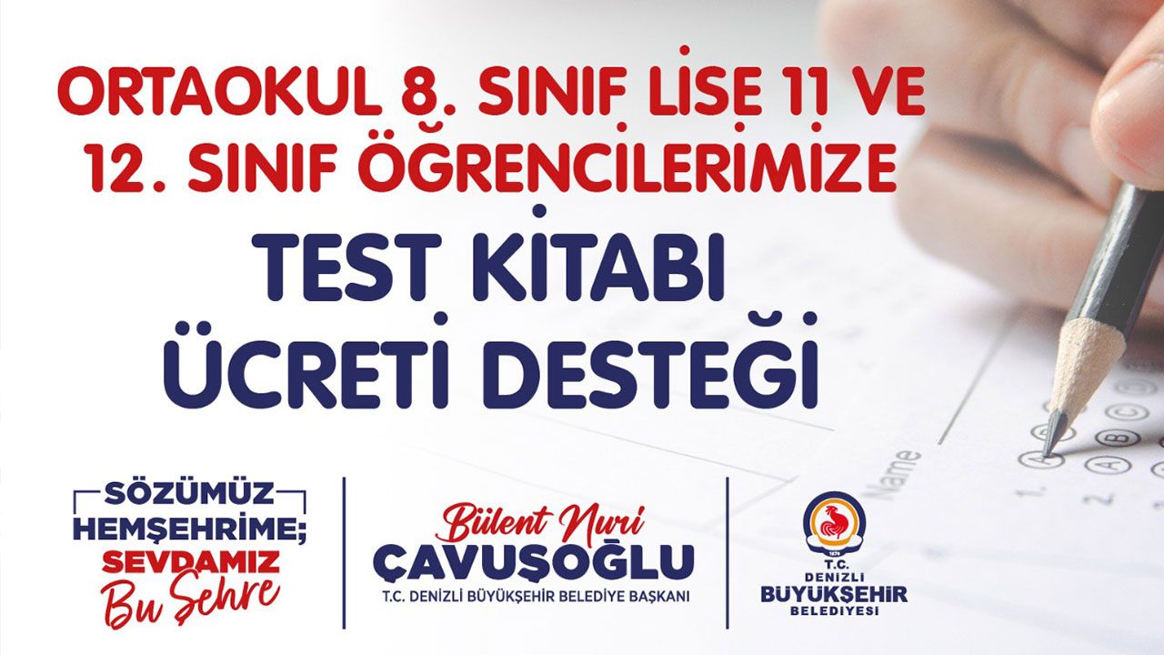 Denizli Haber - Denizli Büyükşehir Belediyesinin ihtiyaç sahibi ailelerin Liselere Geçiş Sınavı (LGS) ve Yükseköğretim Kurumları Sınavı’na (YKS) girecek öğrencilerine vereceği Test Kitabı Ücreti Desteği projesinden faydalanmak için son haftaya girildi. Denizli Büyükşehir Belediyesi Sosyal Hizmetler Dairesi Başkanlığının yürüttüğü sosyal destek projesi kapsamında LGS’ye hazırlanan ortaokul 8. sınıf ile YKS’ye girecek lise 11 ve 12’nci sınıf öğrencilerine 2025-2026 eğitim-öğretim yılında 2.500,00 TL‘ye kadar test kitabı ücreti desteği verilecek. Denizli Büyükşehir Belediye Başkanı Bülent Nuri Çavuşoğlu’nun dar gelirli ailelerin bütçelerini sarsan sınav masraflarını azaltmak ve eğitimde fırsat eşitliğine katkı sunmak için hayata geçirdiği projeye www.denizli.bel.tr veya https://apps.denizli.bel.tr/testkitabibasvuru/ adresinden online müracaat yapılıyor. Denizli il sınırları içerisinde ikamet eden ve belirtilen şartları taşıyan öğrencilerin müracaatlarını 31 Aralık 2025’e kadar yapması gerekiyor.