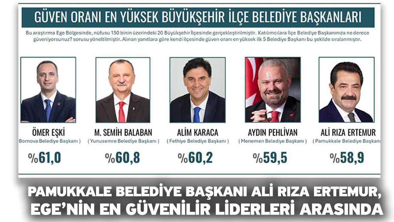Denizli Haber - ORC Araştırma Şirketi tarafından 27 Şubat-4 Mart 2026 tarihleri arasında Ege Bölgesi’ndeki 20 ilçede 7 bin 200 katılımcı ile yapılan çalışmada vatandaşlara, “İlçe Belediye Başkanınıza ne derece güveniyorsunuz?” sorusu yöneltildi. Araştırma sonucunda açıklanan verilerde Pamukkale Belediye Başkanı Ali Rıza Ertemur, yüzde 58,9’luk güven oranıyla listenin ilk 5 sırasında yer alarak halkın takdirini topladığını kanıtladı.