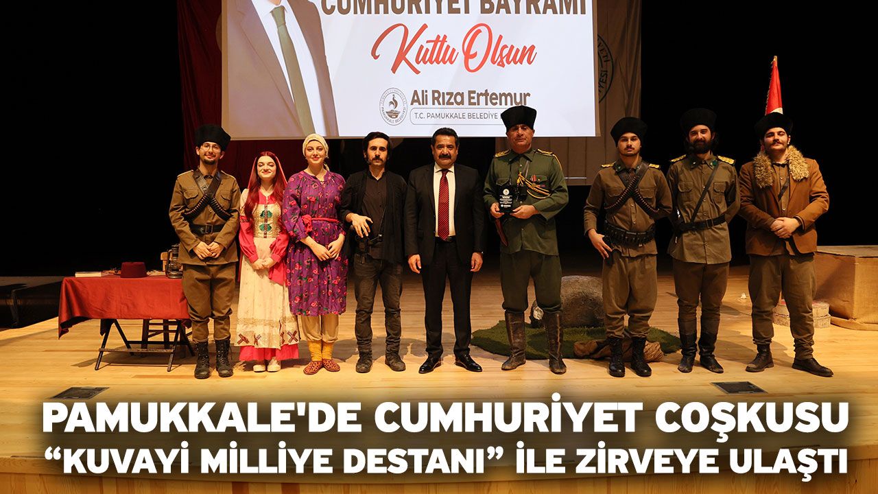 Denizli Haber - Cumhuriyetin 102. yıl dönümünü coşku ve gururla kutlayan Pamukkale Belediyesi, 26–29 Ekim tarihleri arasında düzenlediği etkinliklerle sanat, spor ve kültürü bir araya getirdi. Çocuk tiyatrosundan resim sergisine, müzik dinletisinden futbol turnuvasına uzanan renkli etkinliklerin en özel gecesi, Nazım Hikmet’in ölümsüz eseri olan Kuvayi Milliye Destanı’nın sahnelendiği tiyatro gösterisi oldu. T.C. Denizli Büyükşehir Belediyesi Kongre ve Kültür Merkezi Mehmet Gazi Salonu’nda gerçekleştirilen gösteri, salonu tamamen dolduran vatandaşların yoğun ilgisiyle karşılandı. Ankara Oda Tiyatrosu oyuncuları tarafından sahnelenen, Ünal Çeken’in uyarlayıp yönettiği oyun; Kurtuluş Savaşı’nın destansı ruhunu, halkın direnişini ve yeniden doğuşunu etkileyici bir biçimde izleyiciyle buluşturdu.