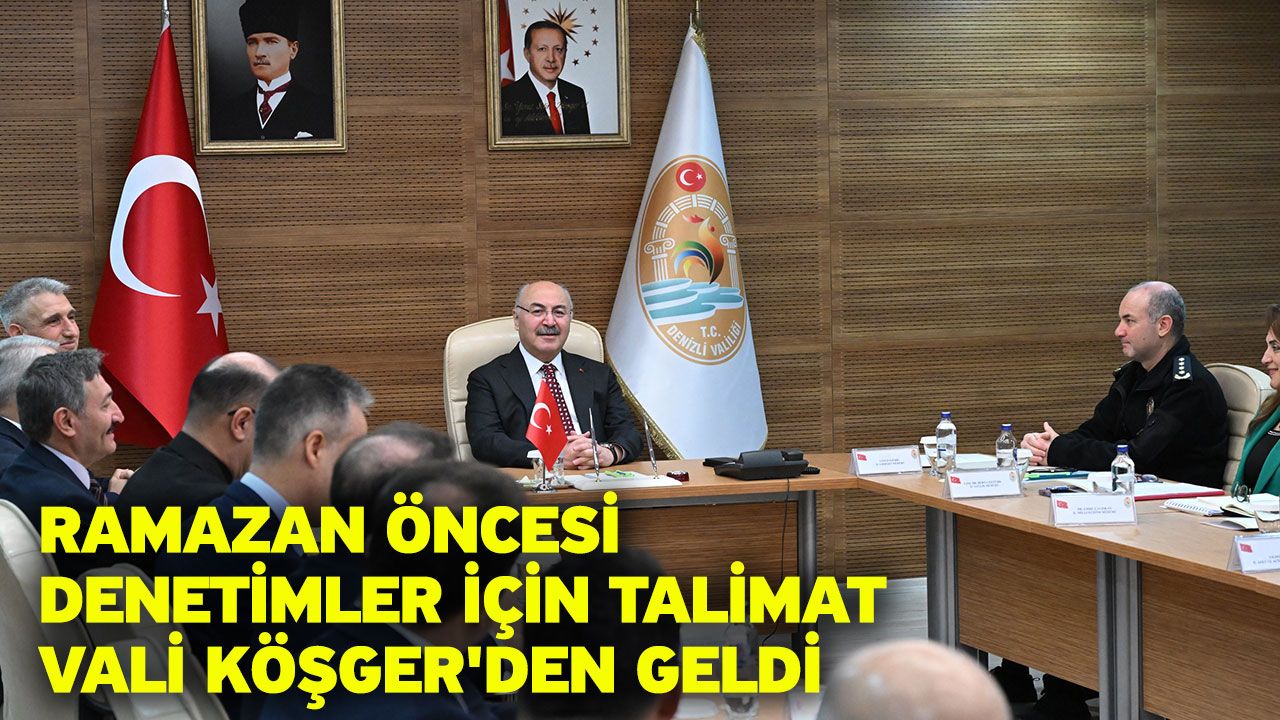 Denizli Valisi Yavuz Selim Köşger bölge ve il müdürleriyle gerçekleştirdiği toplantıda kamu hizmetlerinde disiplin, mevzuata uygunluk, mesaiye riayet ve vatandaş memnuniyeti konuları ele alınırken, Ramazan ayı öncesi denetimlerin artırılması talimatı verildi.