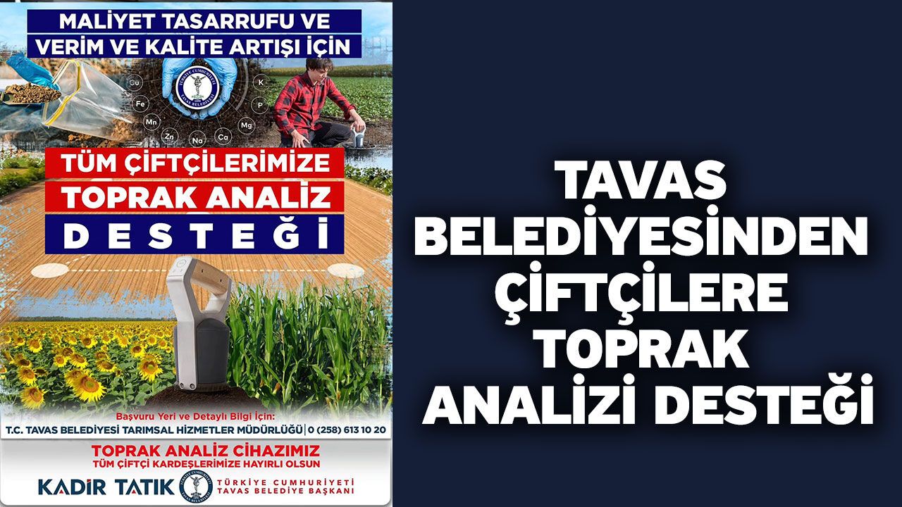 Tavas Belediyesi, tarımsal üretimi artırmak ve çiftçilere destek olmak amacıyla Toprak Analizi hizmeti başlattı. Başvurular Tarımsal Hizmetler Müdürlüğü’nden yapılabilecek.
