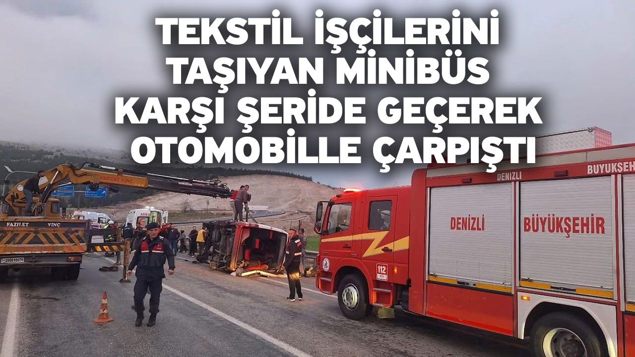 Denizli Haber - Kaza, Tavas ilçesi Denizli-Muğla Karayolu Sarabat Mahallesi’nde meydana geldi. Edinilen bilgilere göre, tekstil işçilerini taşıyan A.S. (40) idaresindeki 20 ADT 091 plakalı minibüs, Denizli-Muğla Karayolu'nda seyir halindeyken Tavas makası mevkiine geldiğinde direksiyon hakimiyetini kaybetmesi sonucu refüjü aşarak karşı şeride geçti. Karşı yönden gelen D.A. yönetimindeki 20 ABA 768 plakalı otomobile çarptı. Çarpmanın etkisiyle işçileri taşıyan minibüs devrildi. Kazayı gören çevredeki vatandaşların ihbarı üzerine bölgeye çok sayıda itfaiye, polis, jandarma ve sağlık ekipleri sevk edildi.