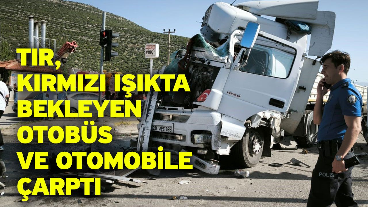 Tır, kırmızı ışıkta bekleyen otobüs ve otomobile çarptı