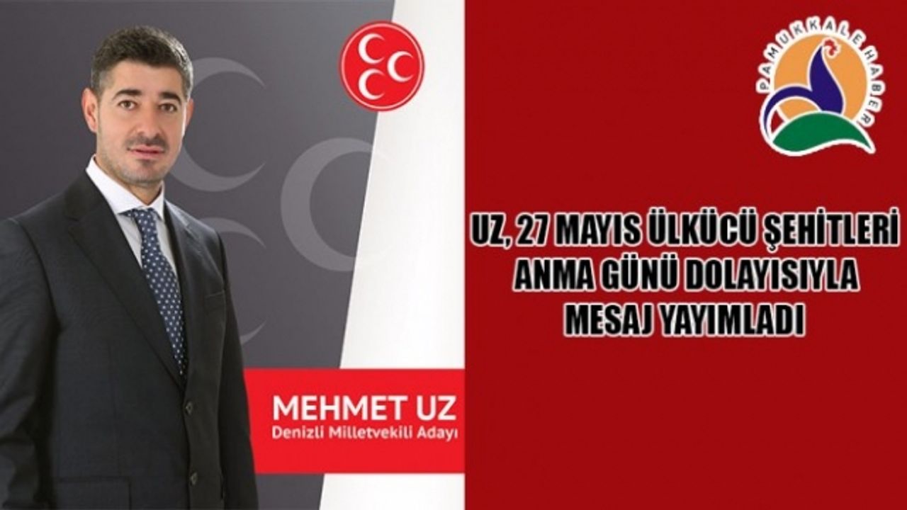 Milliyetçi Hareket Partisi (MHP) Denizli Milletvekili Adayı Mehmet Uz 27 Mayıs Ülkücü Şehitleri Anma Günü vesilesiyle bir mesaj yayımladı. Millet, devlet ve bayrak uğruna hayatlarını kaybetmiş dava yolcusu kardeşlerini unutturmayacaklarının altını çizen Uz, "Türk milletinin maddi ve manevi bünyesinde gedikler açmaya, içinden ve dışından tavizler koparmaya çalışan mihraklara karşı en büyük engel milliyetçi ve ülkücü hareket olmuştur. Bundan sonra da böyle olmaya devam edecektir. İçimizi karıştıracak parazitlere, kardeşliğimizi sakatlayacak eğilimlere fırsat ve imkân vermeyeceğiz" dedi.