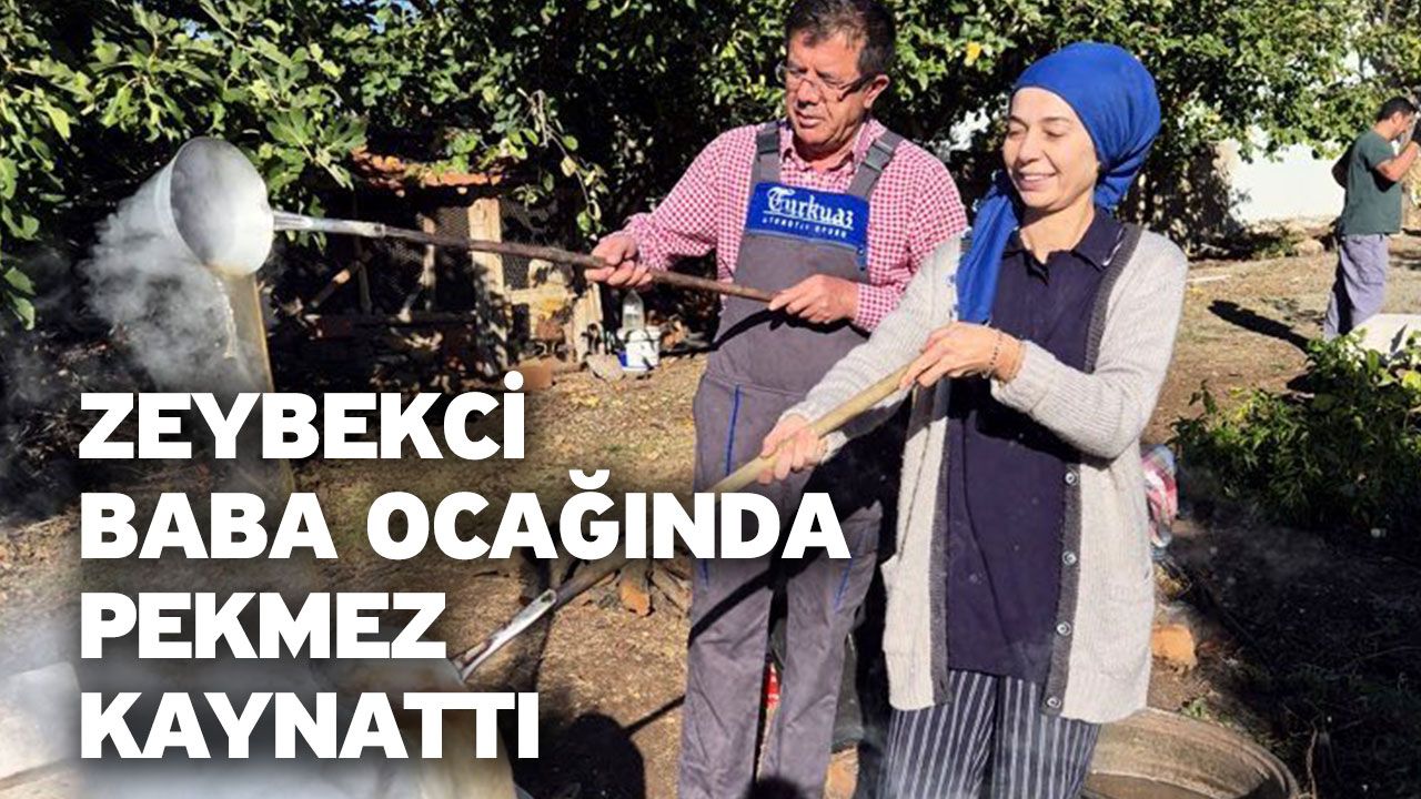 Eşi Ayşen Zeybekci ile birlikte aileye ait bağlardan toplanan üzümlerin sıkılmasının ardından kurulan kazanların başına geçen Zeybekci, tulumunu giyip eline kepçeyi alarak kaynayan pekmezleri karıştırdı.